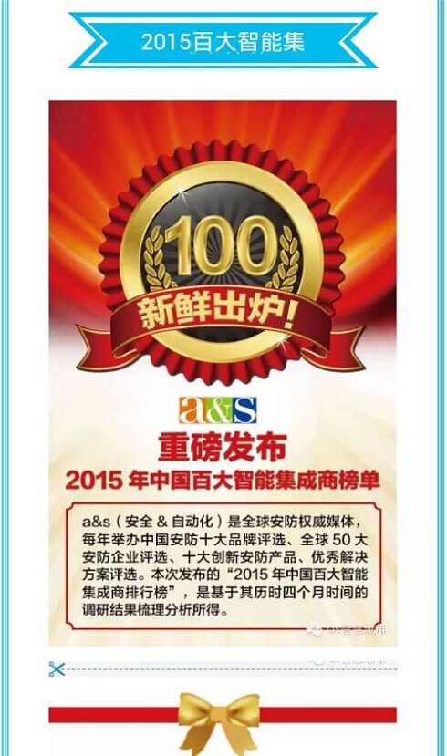 由安全&自動(dòng)化雜志承辦,工信部下屬中國電子學(xué)會(huì)信息系統(tǒng)集成分會(huì)主辦的第一屆百大智慧安防集成商評選活動(dòng),吸引了來自智能化產(chǎn)業(yè)的超過200位高端嘉賓參會(huì),包括政府部門、國內(nèi)外知名智能化企業(yè)以及智能化產(chǎn)業(yè)的專家、學(xué)者、企業(yè)高管、技術(shù)總監(jiān)等,經(jīng)過長達(dá)4個(gè)月的角逐,我公司從評選活動(dòng)的6萬名智能集成商中脫穎而出,獲得“2015中國百大智能集成企業(yè)”的榮譽(yù) 。a&s(安全&自動(dòng)化)是全球安防權(quán)威媒體,每年舉辦全國安防十大品牌評選、全球50大安防品牌評選、十大創(chuàng)新安防產(chǎn)品、優(yōu)秀解決方案評選。本次發(fā)布的“2015年中國百大集成商排行榜”是經(jīng)過四個(gè)月調(diào)研結(jié)果梳理分析所得。