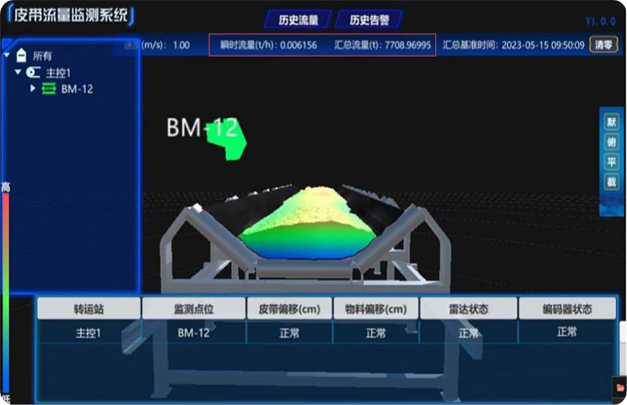 傳送皮帶流量監(jiān)測系統(tǒng)采用高頻紅外激光雷達掃描及智能算法相結合的技 術方案,實現(xiàn)皮帶運輸流量的實時監(jiān)測及累計流量監(jiān)測,皮帶跑偏檢測、報警及 轉運站卡堵預警等功能。