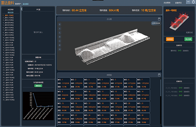 通過(guò)激光檢測(cè)器對(duì)料場(chǎng)進(jìn)行掃描,通過(guò)算法快速計(jì)算出物料體積。